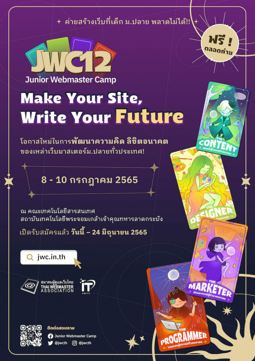 Junior Webmaster Camp 12 จัดขึ้นภายใต้แนวคิด “Make Your Site, Write Your Future” ซึ่งมุ่งเน้นการเปิดโอกาสให้เยาวชนได้พัฒนาทักษะด้านเว็บไซต์ ควบคู่ไปกับการค้นหาตัวตนและเส้นทางในอนาคต ผ่านกระบวนการเรียนรู้เชิงปฏิบัติการในรูปแบบค่ายพักค้างคืน ระหว่างวันที่ วันศุกร์ที่ 8 ถึง วันอาทิตย์ที่ 10 กรกฎาคม 2565 ณ คณะเทคโนโลยีสารสนเทศ สถาบันเทคโนโลยีพระจอมเกล้าเจ้าคุณทหารลาดกระบัง