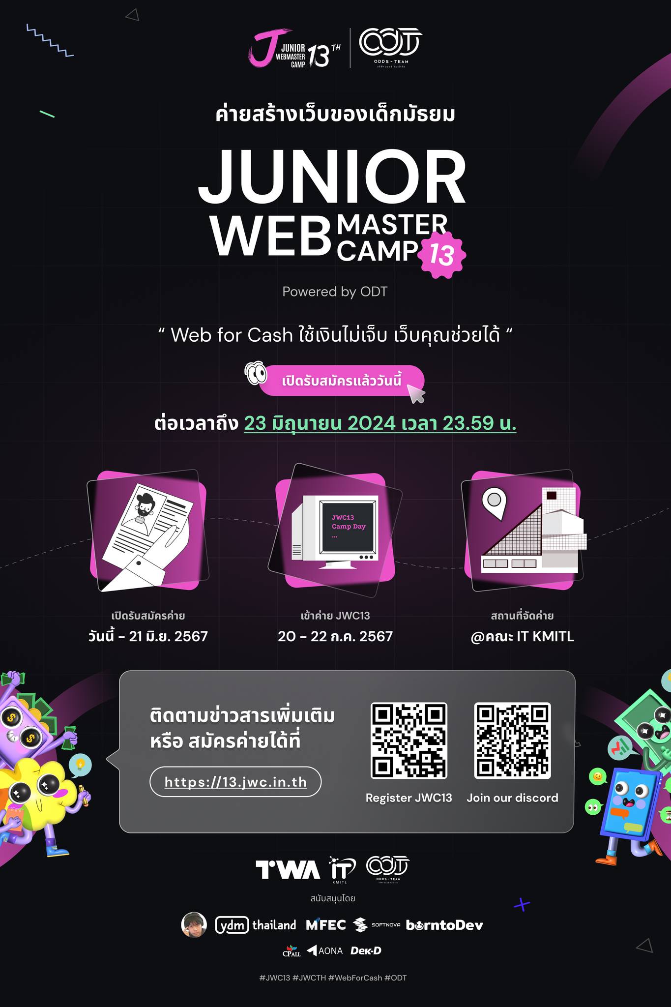 Junior Webmaster Camp ครั้งที่ 13 จัดขึ้นระหว่างวันที่ วันเสาร์ที่ 20 ถึง วันจันทร์ที่ 22 กรกฎาคม 2567 ณ คณะเทคโนโลยีสารสนเทศ สถาบันเทคโนโลยีพระจอมเกล้าเจ้าคุณทหารลาดกระบัง โดยเป็นกิจกรรมค่ายอบรมเชิงปฏิบัติการแบบเข้มข้น ระยะเวลา 3 วัน 2 คืน เปิดโอกาสให้ผู้เข้าร่วมได้เรียนรู้ผ่านการลงมือปฏิบัติจริง การทำงานเป็นทีม และการพัฒนาโครงการเว็บไซต์ในสภาพแวดล้อมที่ใกล้เคียงกับการทำงานจริง ทั้งนี้ ผู้เข้าร่วมกิจกรรมจะได้รับการจัดสรรที่พักภายในโครงการ และไม่มีค่าใช้จ่ายตลอดการเข้าร่วม