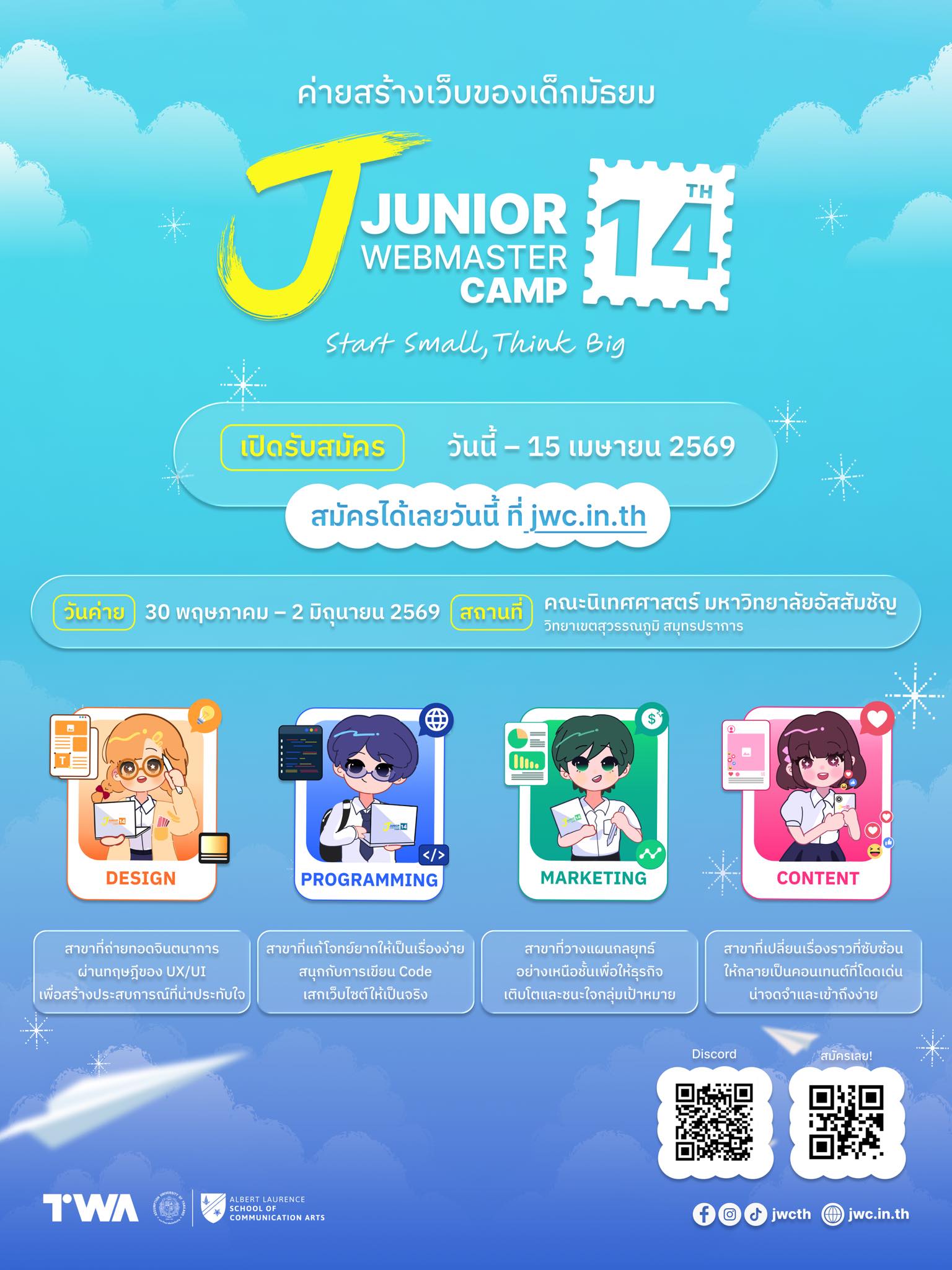Junior Webmaster Camp เป็นกิจกรรมค่ายอบรมเชิงปฏิบัติการแบบเข้มข้น ระยะเวลา 4 วัน 3 คืน ซึ่งจัดขึ้นระหว่างวันที่ วันเสาร์ที่ 30 พฤษภาคม ถึง วันอังคารที่ 2 มิถุนายน 2569 ณ คณะนิเทศศาสตร์ มหาวิทยาลัยอัสสัมชัญ วิทยาเขตสุวรรณภูมิ จังหวัดสมุทรปราการ โดยมีรูปแบบกิจกรรมเป็นการเรียนรู้ผ่านการลงมือปฏิบัติจริง (Hands-on Experience) ควบคู่กับการทำงานเป็นทีม และการพัฒนาทักษะในบริบทของอุตสาหกรรมดิจิทัลในปัจจุบัน ทั้งนี้ ผู้เข้าร่วมกิจกรรมจะได้พักค้างคืนภายในสถานที่ที่จัดเตรียมไว้โดยไม่มีค่าใช้จ่ายตลอดโครงการ